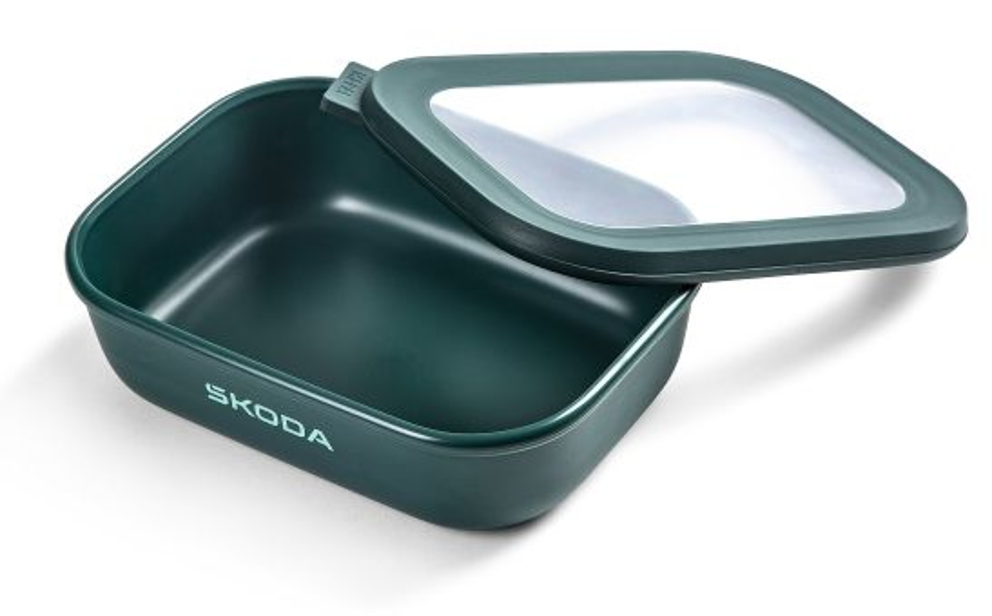 Boîte à lunch élégante en vert émeraude avec le logo ŠKODA. Capacité : 1 000 ml. Compatible avec le congélateur, le micro-ondes (sans le couvercle) et le lave-vaisselle. Étanche, hermétique et fabriquée sans BPA.