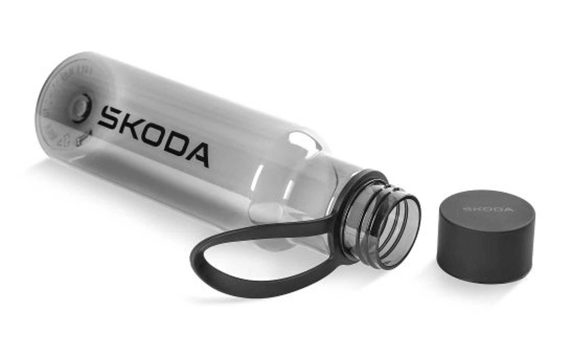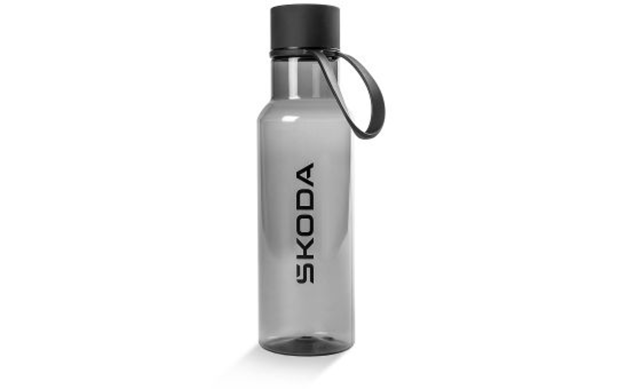 Praktische drinkfles van BPA-vrij tritan. RVS-deksel met zwarte rubberlaag voor een goede grip en voorzien van draagriem. Bedrukt met zwart Škoda-logo. Diameter: 68 mm. Inhoud: 600 ml.