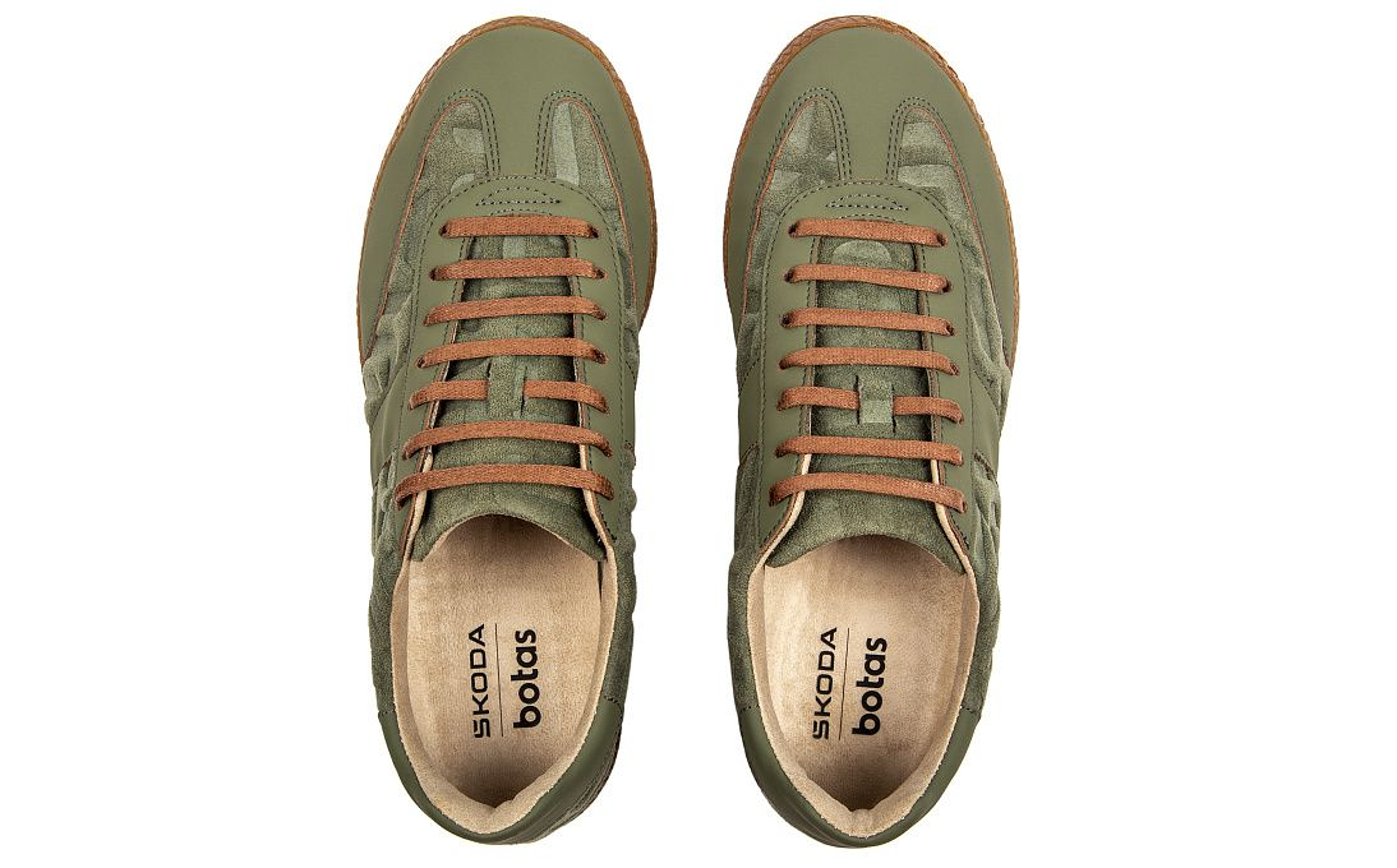 Botas x ŠKODA Explorer schoenen met geperste bovenzijde van glad leer en geborsteld microvezeltricot. Rubberen zool, anatomische binnenzool en veters in groen en bruin. Iconisch Š-logo speciaal ontworpen door ŠKODA Auto. Materiaal: rubbere zool, glad leer, microvezeltricot.